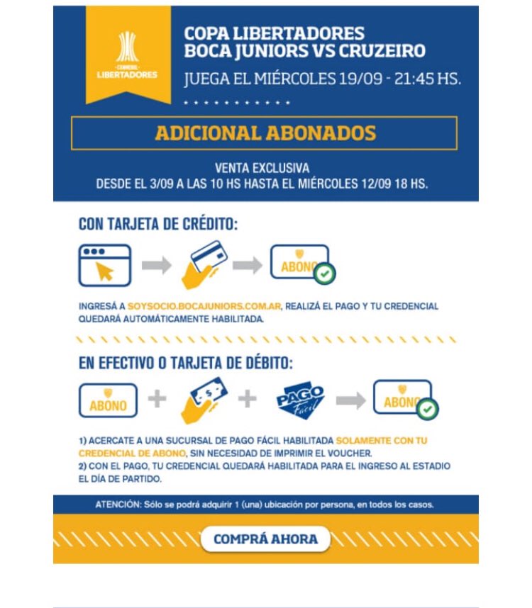 Los abonados de Boca Juniors desde hoy ya pueden sacar su adicional para la ida de los cuartos de la Copa Libertadores frente a Cruzeiro de Brasil, partido que se disputará el miércoles 19 de septiembre a las 21:45 en La Bombonera.