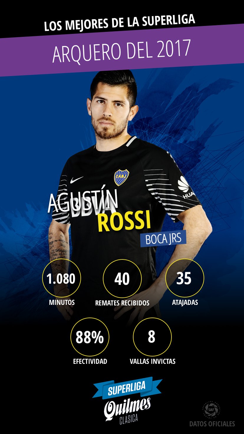 Agustín Rossi sigue acumulando premios que sirven para marcar el buen nivel que tuvo protegiendo los tres palos del único grande. Luego de ganar a mejor arquero de los meses de octubre y diciembre, la Superliga lo eligió como el más destacado en su puesto durante el último semestre.